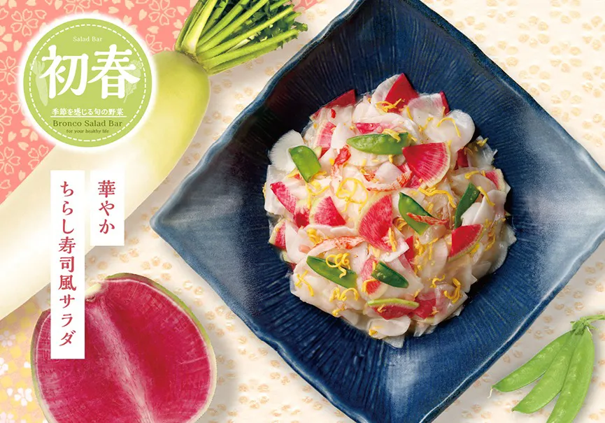大根、菜の花など冬から春にかけて旬を迎える野菜を使用した、ブロンコビリー自慢のオリジナルサラダをお楽しみください。